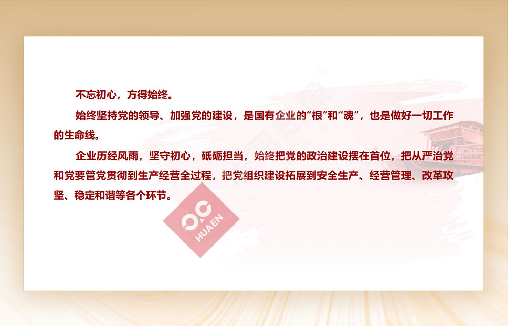 設(shè)計(jì)理念:不忘初心,方得始終。始終堅(jiān)持黨的領(lǐng)導(dǎo)、加強(qiáng)黨的建設(shè),是國(guó)有企業(yè)的"根"和"魂”,也是做好一切工作的生命線。企業(yè)歷經(jīng)風(fēng)雨,堅(jiān)守初心,砥礪擔(dān)當(dāng),始終把黨的政治建設(shè)擺在首位,把從嚴(yán)治黨和黨要管黨貫徹到生產(chǎn)經(jīng)營(yíng)全過程,把黨組織建設(shè)拓展到安全生產(chǎn)、經(jīng)營(yíng)管理、改革攻堅(jiān)、穩(wěn)定和諧等各個(gè)環(huán)節(jié)。