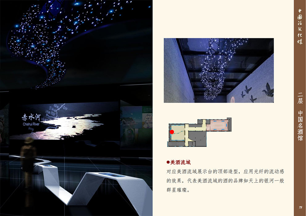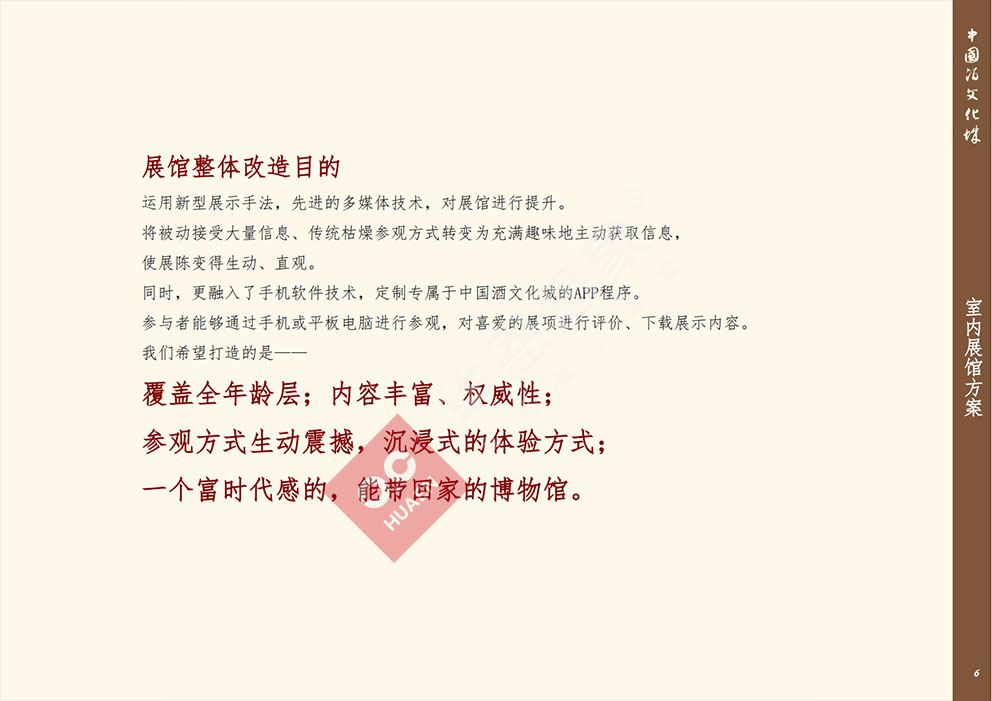 設(shè)計(jì)理念:展館整體改造目的運(yùn)用新型展示手法,先進(jìn)的多媒體技術(shù),對(duì)展館進(jìn)行提升。將被動(dòng)接受大量信息、傳統(tǒng)枯燥參觀方式轉(zhuǎn)變?yōu)槌錆M趣味地主動(dòng)獲取信息,使展陳變得生動(dòng)、直觀同時(shí),更融入了手機(jī)軟件技術(shù),定制專屬于中國(guó)酒文化城的APP程序。參與者能夠通過(guò)手機(jī)或平板電腦進(jìn)行參觀,對(duì)喜愛(ài)的展項(xiàng)進(jìn)行評(píng)價(jià)、下載展示內(nèi)容我們希望打造的是一一覆蓋全年齡層,內(nèi)容豐富、權(quán)威性;參觀方式生動(dòng)震撼,沉浸式的體驗(yàn)方式;一個(gè)富時(shí)代感的,能帶回家的博物館。