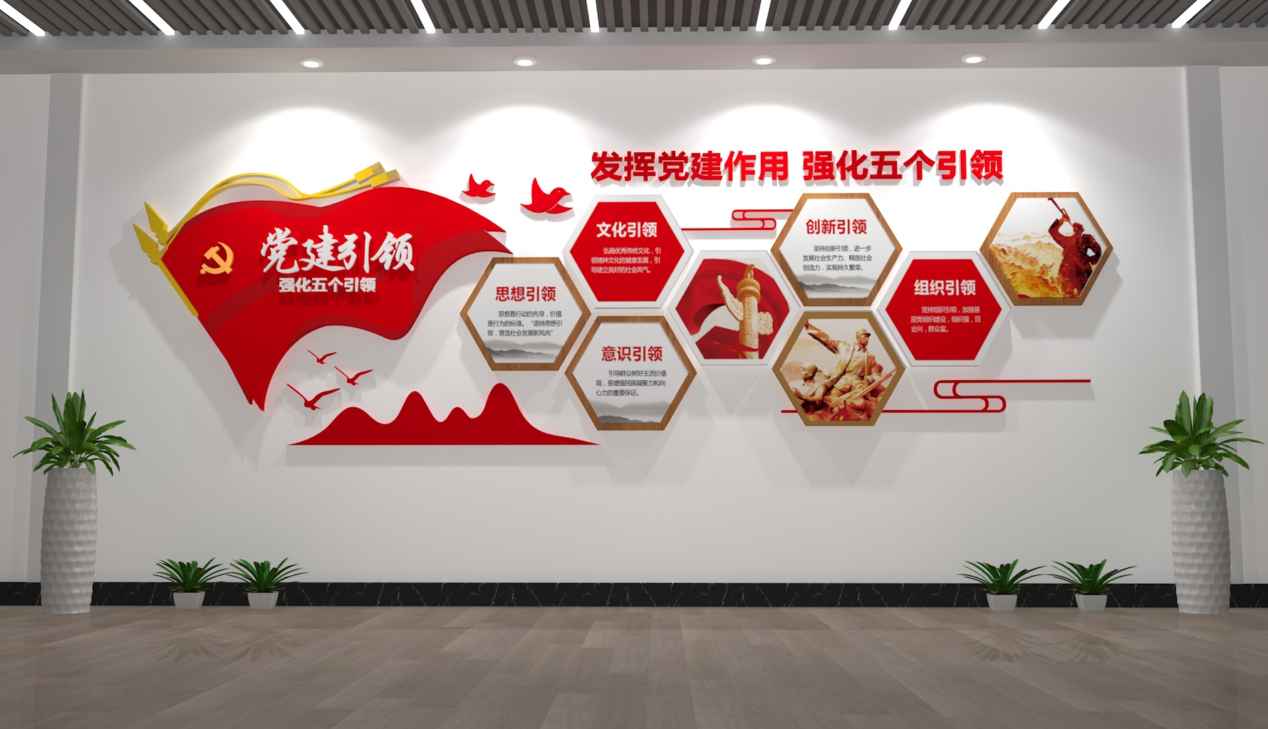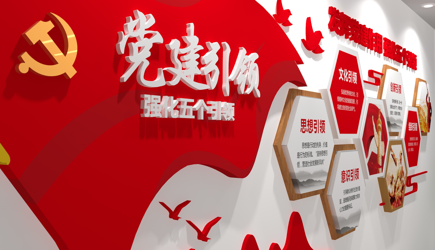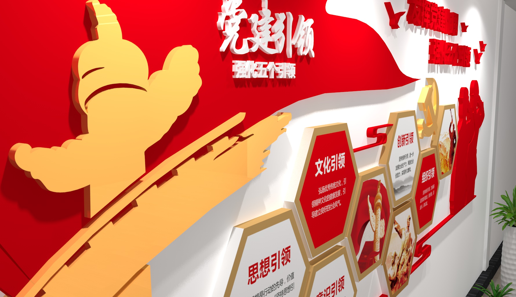 - 細(xì)節(jié)點(diǎn)綴:加入紅色元素小裝飾(如微型黨旗、黨章擺件、紅色書籍模型),企業(yè)展廳可結(jié)合行業(yè)特色(如電力企業(yè)加“黨建+安全用電”圖標(biāo),農(nóng)業(yè)企業(yè)加“黨建+鄉(xiāng)村振興”插畫)。